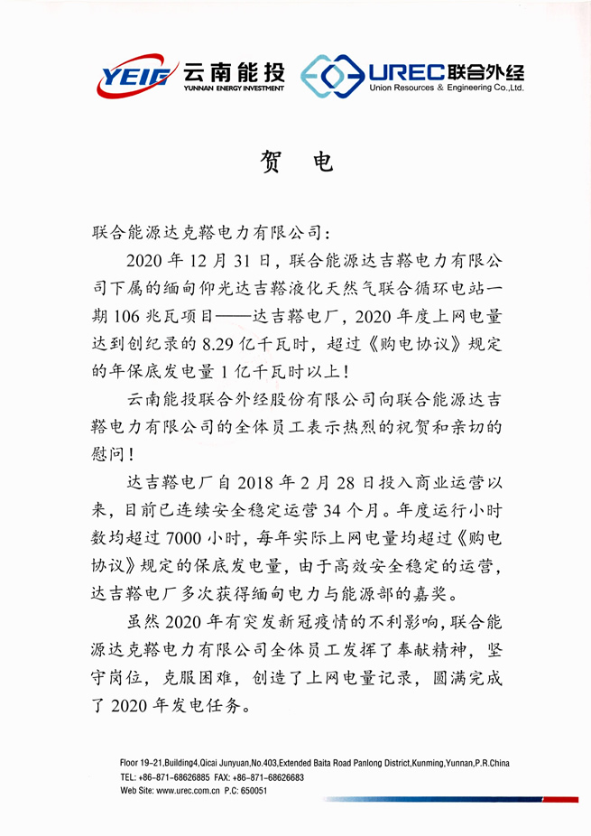 2020年12月31日,聯(lián)合能源達(dá)克鞳電力有限公司下屬的緬甸仰光達(dá)克鞳液化天然氣聯(lián)合循環(huán)電站一期106MW項目(以下簡稱“達(dá)克鞳電廠”) 2020年度上網(wǎng)電量達(dá)到創(chuàng)紀(jì)錄的8.29億度電,超過《購電協(xié)議(PPA)》規(guī)定的年保底發(fā)電量1億度以上!