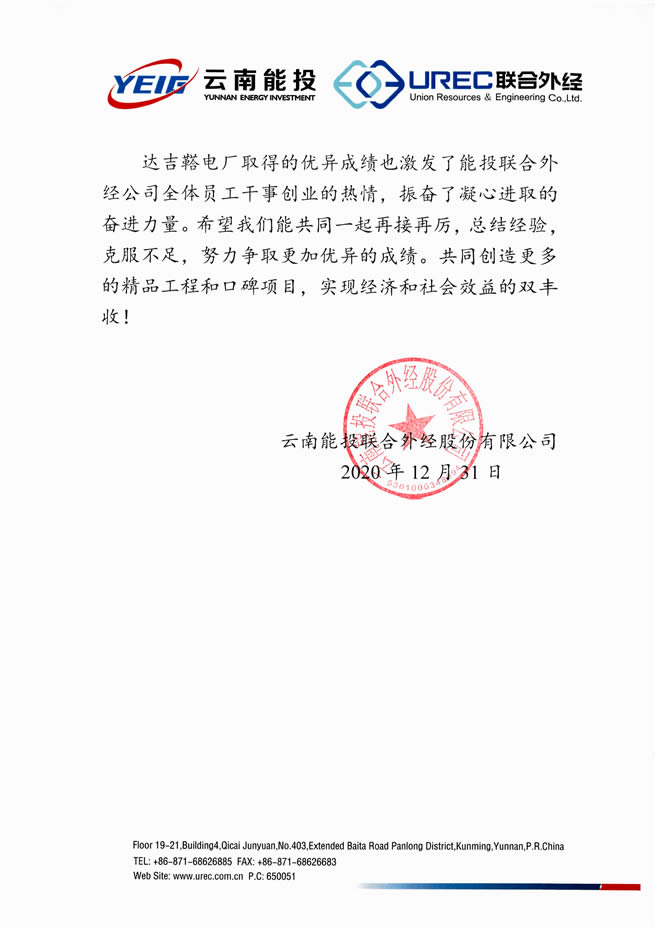 盡管今年有突發(fā)新冠疫情的不利影響,聯(lián)合能源達(dá)克鞳電力有限公司全體員工發(fā)揮了奉獻(xiàn)精神,堅守崗位,克服困難,創(chuàng)造了上網(wǎng)電量記錄,圓滿完成了2020年發(fā)電任務(wù)。能投聯(lián)合外經(jīng)總經(jīng)理馮柯向達(dá)克鞳項目公司表達(dá)了祝賀,并勉勵聯(lián)合外經(jīng)所有同仁2021年再創(chuàng)佳績!