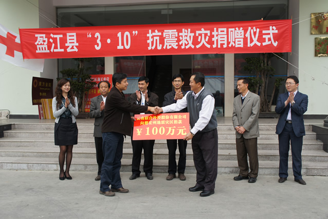 3月10日12時(shí)58分,云南省盈江縣發(fā)生5.8級地震。25人遇難,314人受傷,10余萬間房屋頃刻間倒塌損壞。 為幫助災(zāi)區(qū)人民重建家園盡我們的一份綿薄之力,3月19日,馮總代表我公司向云南省德宏州盈江縣災(zāi)區(qū)捐款100萬人民幣。將我們的愛心傳遞,為災(zāi)區(qū)人民祈福,希望災(zāi)區(qū)人民克服一切困難,早日重建美好家園!